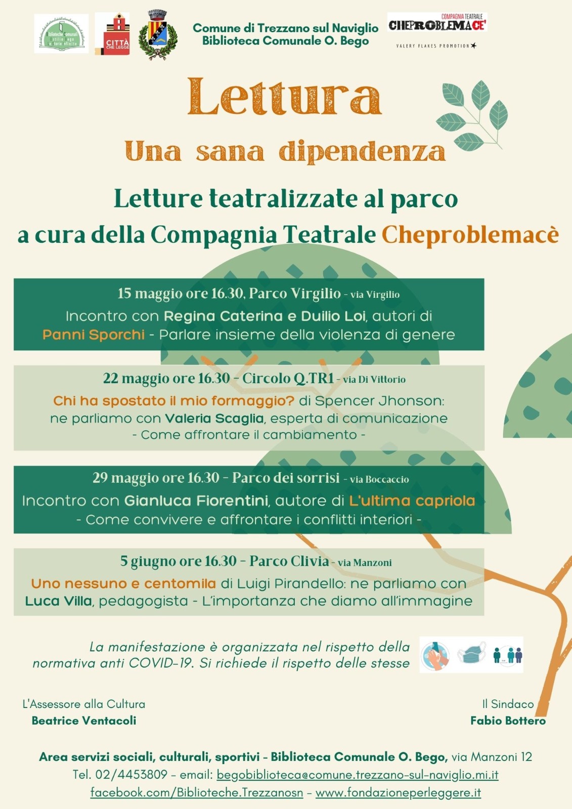 Trezzano sul Naviglio, 10 maggio 2021 – Quattro appuntamenti nei parchi cittadini per condividere la ripresa della socialità e promuovere la lettura anche al di fuori degli spazi tradizionali. Al via da sabato 15 maggio la rassegna “Letture nei parchi: la lettura una sana dipendenza”, organizzata dall’Amministrazione e le Biblioteche comunali, con la presentazione di libri e le letture animate a cura della Compagnia Teatrale Cheproblemacè.