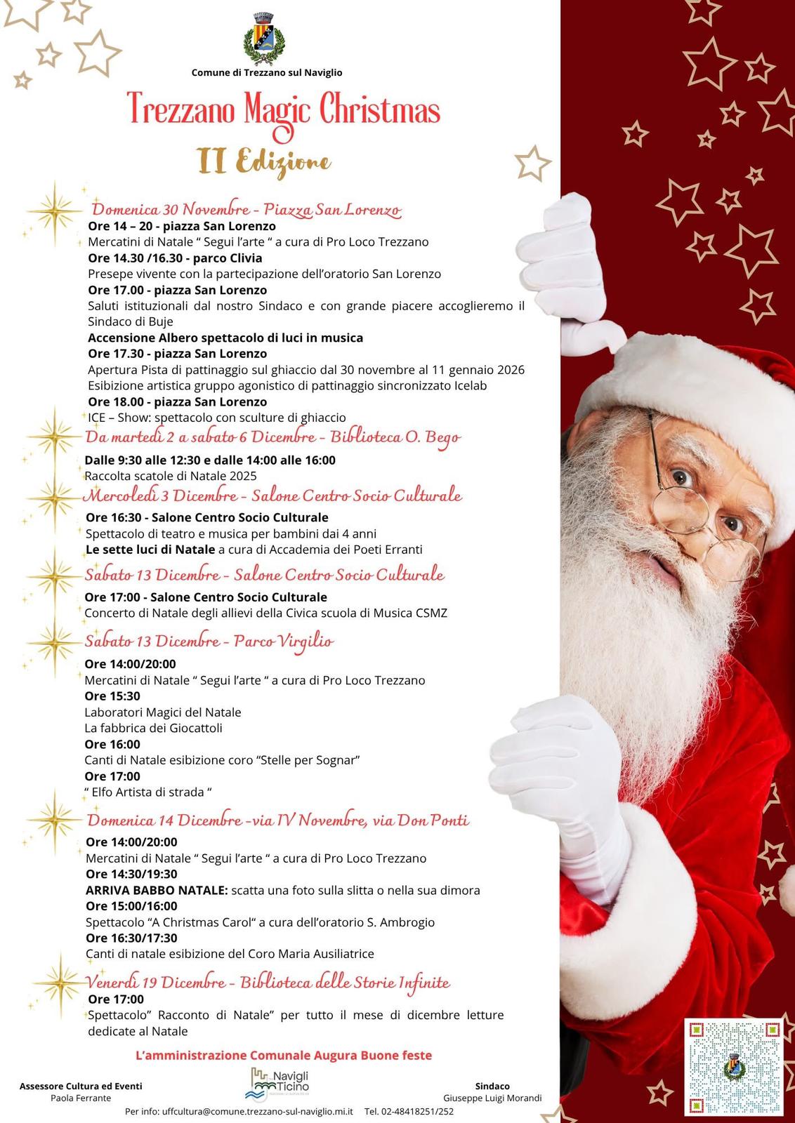 A Trezzano sul Naviglio si accendono le luci del Natale 2025. L'avvio delle festività sarà contraddistinto dall'accensione dell'Albero di Natale in piazza San Lorenzo, domenica 30 novembre, e proseguirà nei giorni successivi fino al 19 dicembre con eventi, iniziative e mercatini in città. L'amministrazione comunale, nell'augurare a tutti Buone Feste, si augura che i cittadini partecipino numerosi alle tante iniziative in programma.