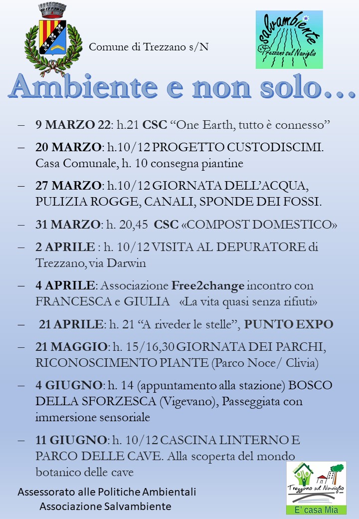 Gli appuntamenti successivi: domenica 27 marzo dalle 10 alle 12 pulizia insieme di rogge, canali e sponde dei fossi; giovedì 31 marzo alle 20.45 al Centro Socio Culturale un incontro con Salvambiente per imparare a fare il compostaggio; sabato 2 aprile alle 10 la visita al depuratore di Trezzano in via Darwin; lunedì 4 aprile con l’associazione Free2change l’incontro con Francesca e Giulia sul tema “La vita quasi senza rifiuti”; giovedì 21 aprile al Punto Expo alle 21 la proiezione del documentario “A riveder le stelle” diretto da Emanuele Caruso; sabato 21 maggio alle 15 la Giornata dei Parchi con un pomeriggio al parco Clivia e al parco del Noce imparando a riconoscere le piante; sabato 4 giugno una passeggiata con immersione sensoriale al Bosco della Sforzesca di Vigevano (ritrovo ore 14 alla stazione); sabato 11 giugno una gita alla Cascina Linterno e al Parco delle Cave per scoprire il mondo botanico delle cave.