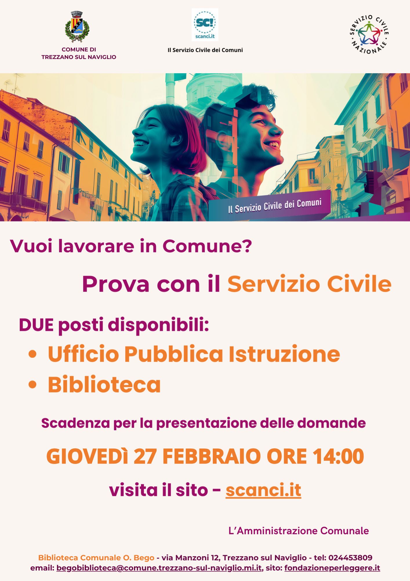 Si informa che sono stati prorogati i termini di presentazione delle domande per il Bando di Servizio Civile 2025. Il nuovo termine di presentazione delle domande è giovedì 27 febbraio ore 14.00