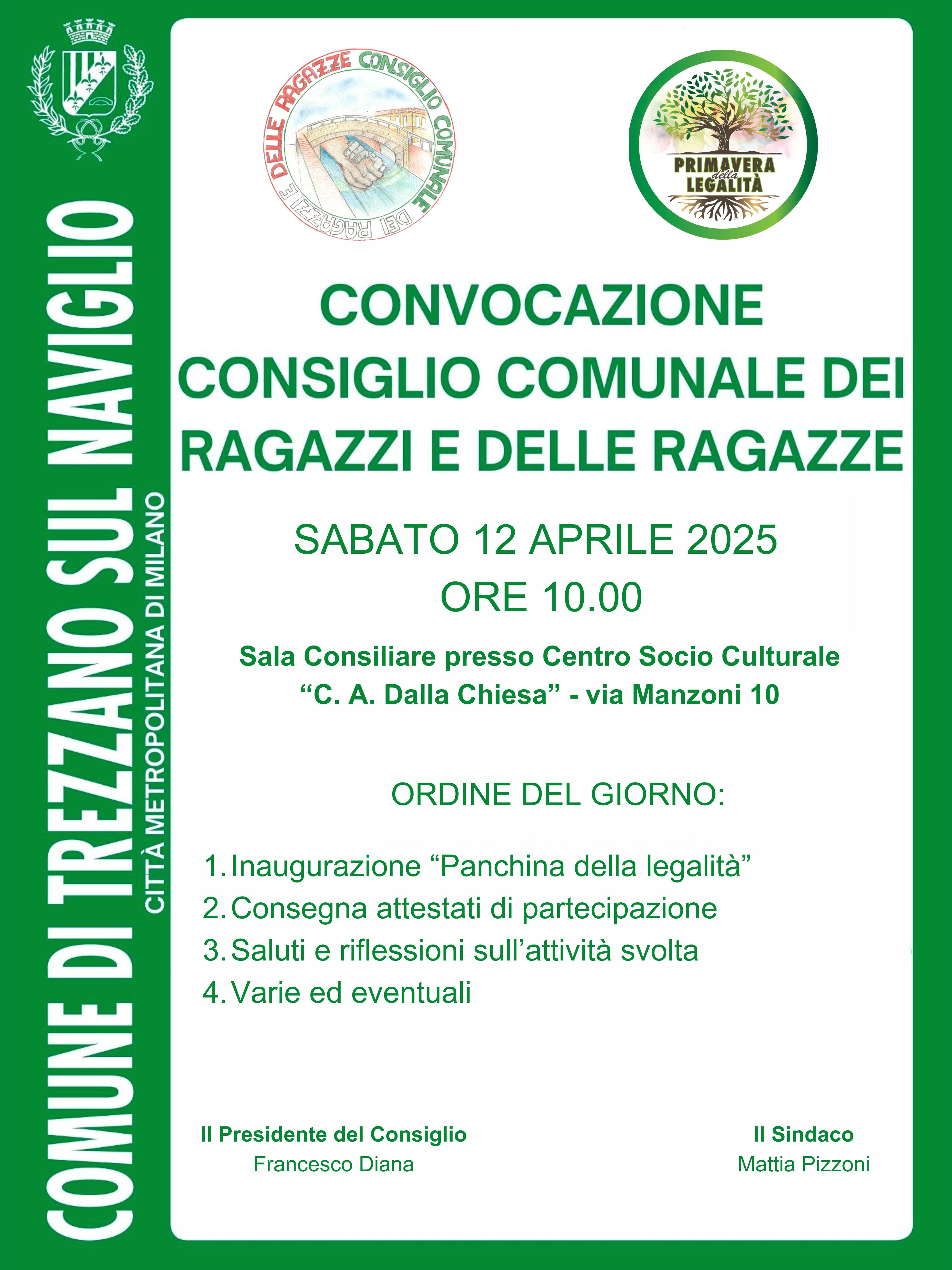 Convocazione della seduta del Consiglio Comunale dei Ragazzi e delle Ragazze - Sabato 12 aprile ore 10:00 presso Sala Consiliare del Centro Socio Culturale, via Manzoni 10
