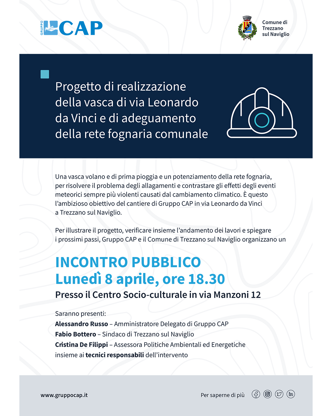 Per illustrare il progetto, verificare insieme l’andamento dei lavori e spiegare i prossimi passi, Gruppo CAP e il Comune di Trezzano sul Naviglio organizzano un
