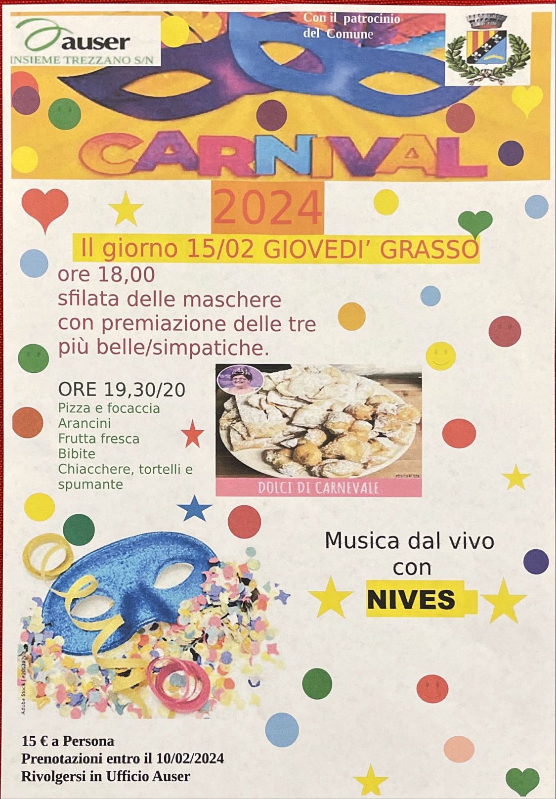ore 19.30/20.00 cena con pizza, arancini, chiacchiere, tortelli, dolci di carnevale e spumante!