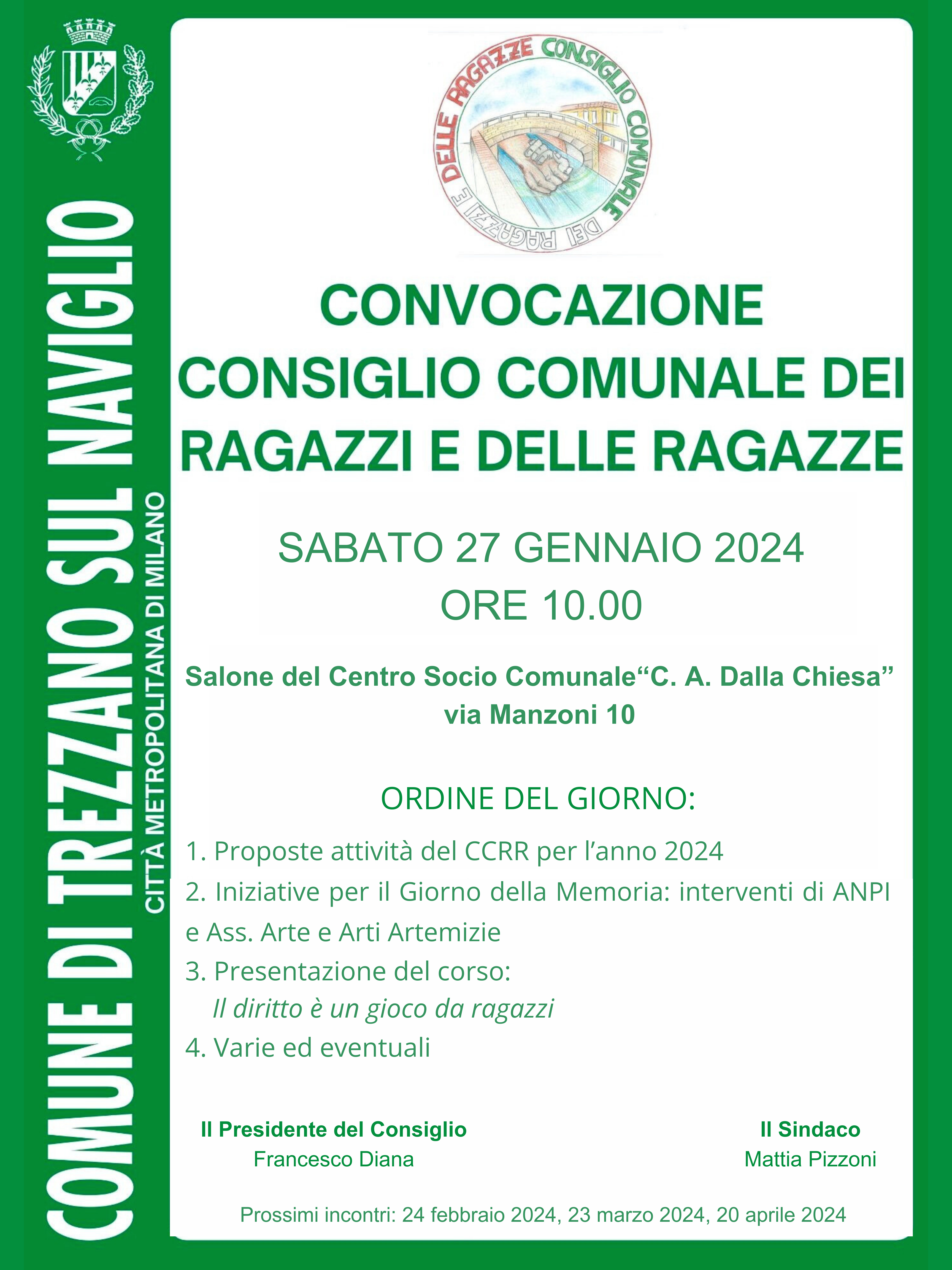 sabato 27 gennaio 2024 ore 10.00 presso il salone del Centro Socio Culturale "C.A Dalla Chiesa" sito in via Manzoni 10.