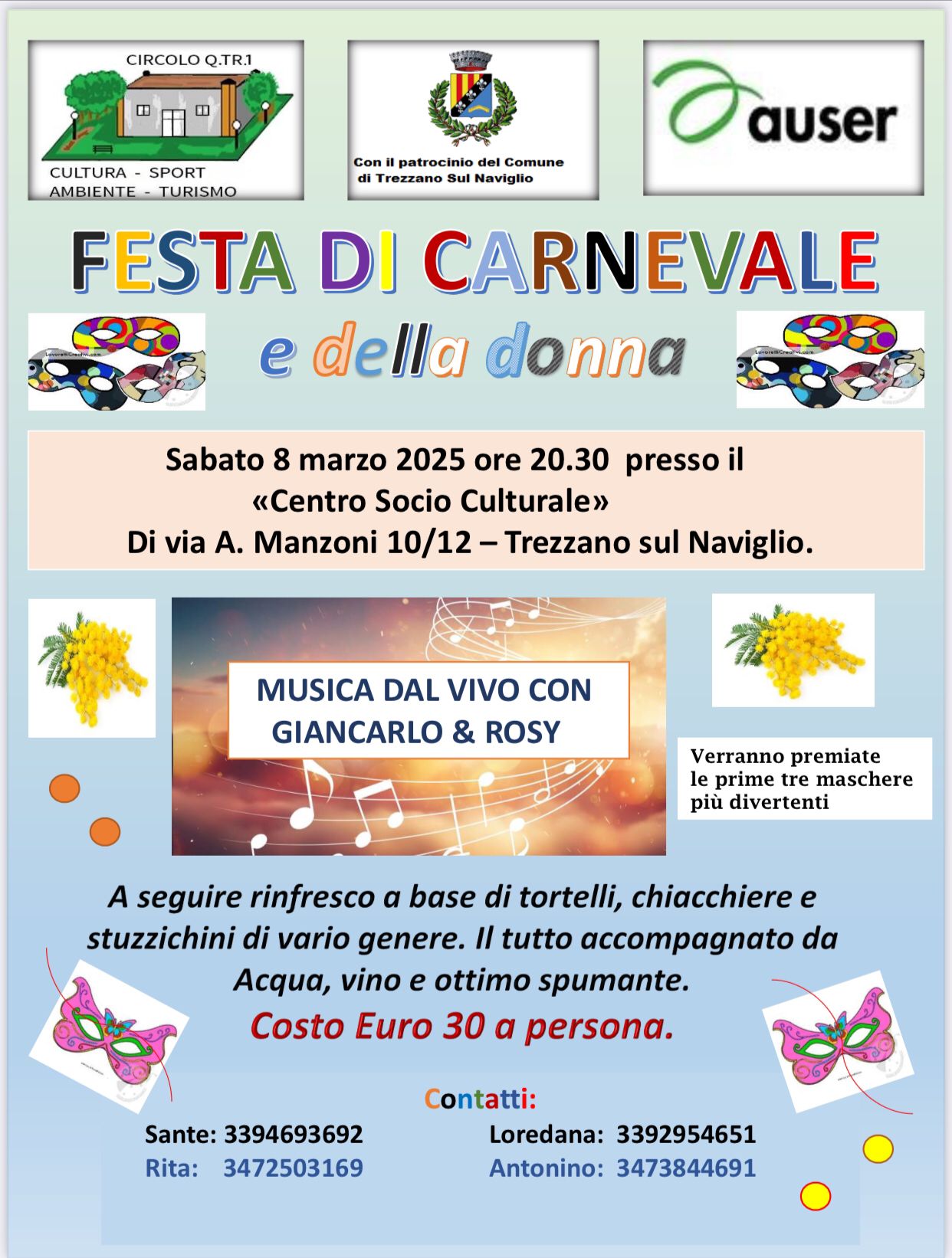 Festa di Carnevale e della Donna organizzata dal Circolo QTR1. Musica dal vivo, premiazione delle maschere più divertenti e rinfresco.
