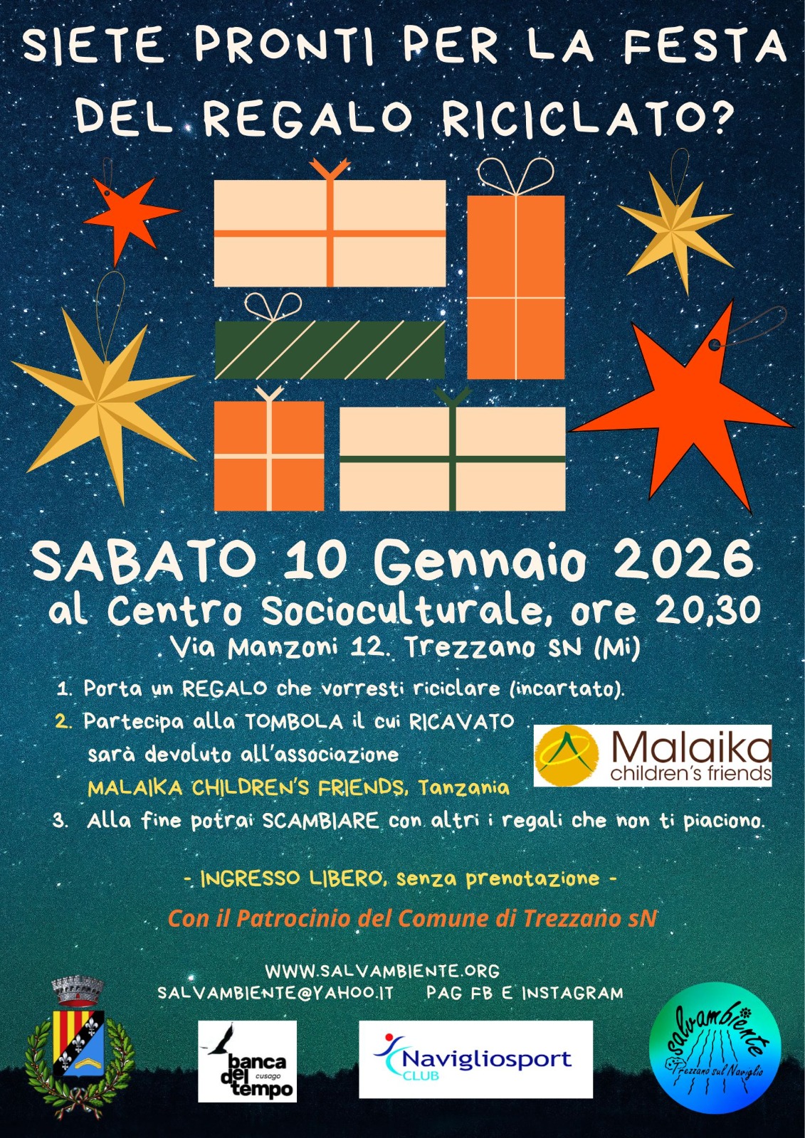 Cos'è Festa del Regalo riciclato 20261. Porta un regalo che vorresti riciclare (incartato);2. Partecipa alla tombola il cui ricavato sarà devoluto in beneficenza;3. Scambio dei doni tra partecipanti.