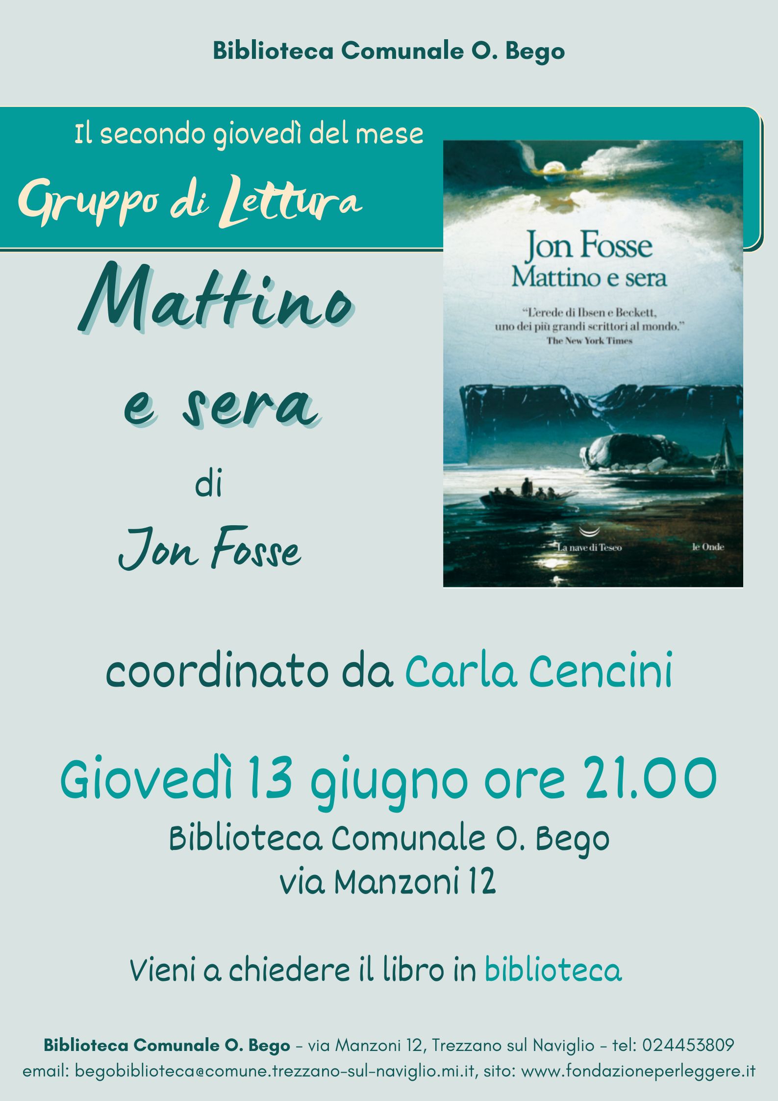 Cos'è Gruppo di lettura: MATTINO E SERA di Jon Fosse Giovedì 13 giugno ore 21.00 presso la Biblioteca Comunale O. Bego sito in via Manzoni 12coordinato da Carla Cencini vieni a chiedere in biblioteca