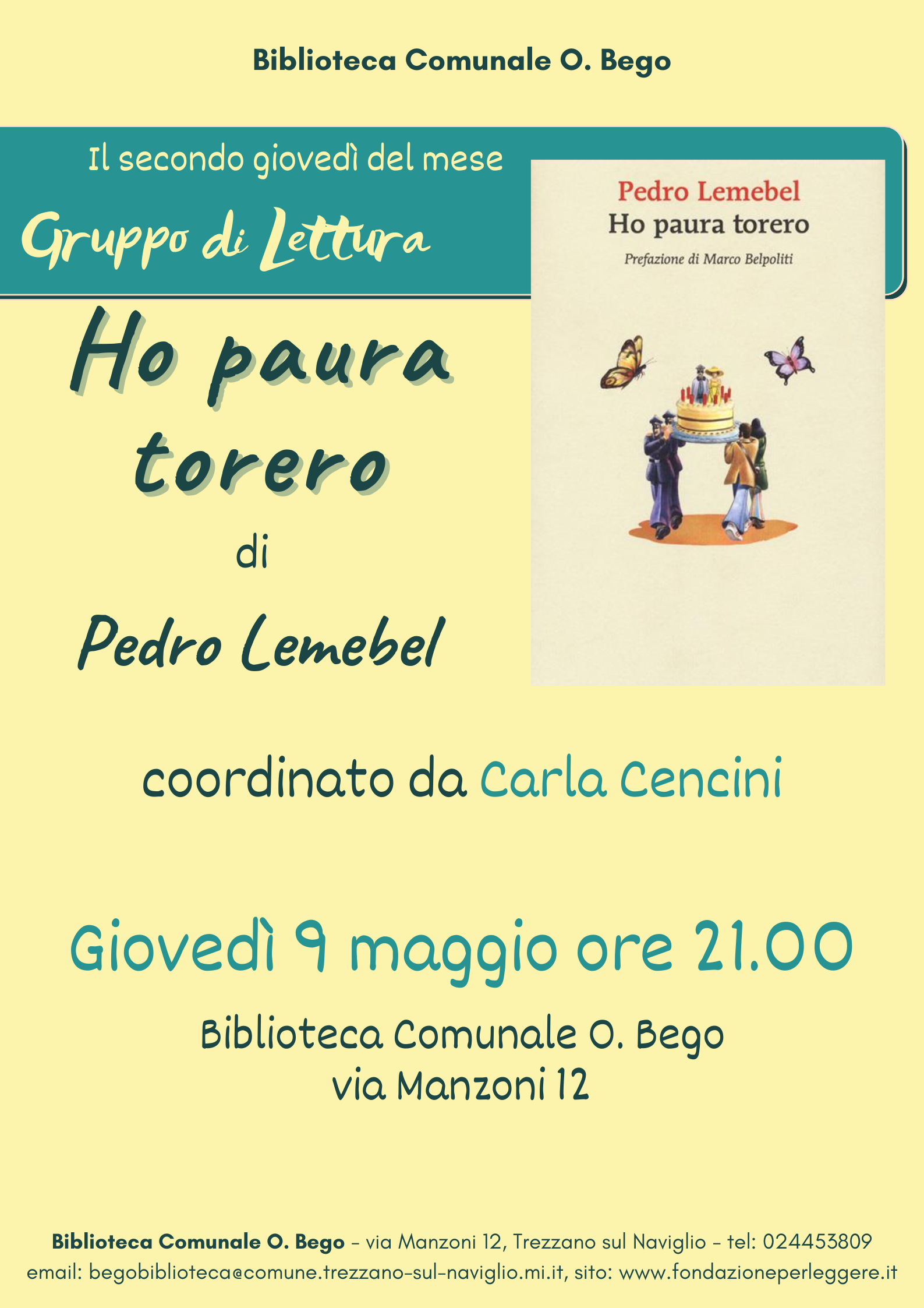Cos'è Gruppo di lettura Ho paura Torero di Pedro Lemebelcoordinato da Carla Cencini, giovedì 9 maggio ore 21.00 presso la Biblioteca Comunale O.Bego sita in via Manzoni 12