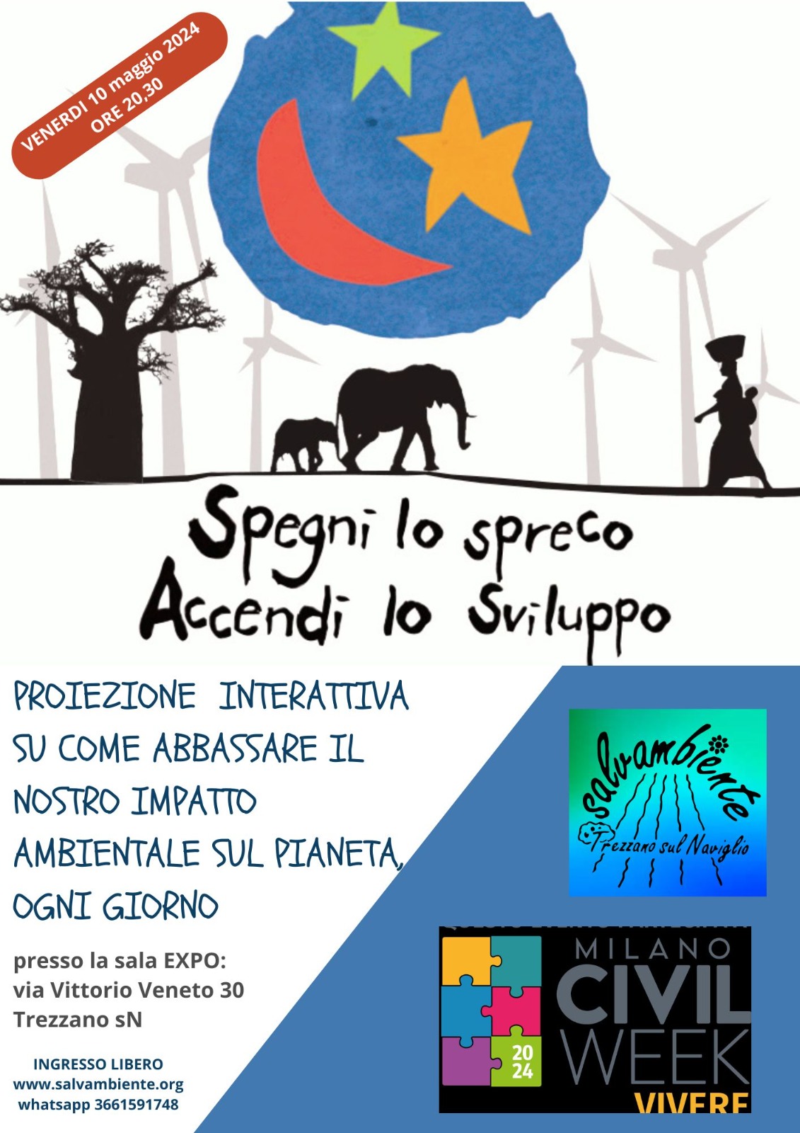 venerdì 10 maggio alle ore 20.30 presso la sala EXPO sita in via Vittorio Veneto 30, Trezzano s/N in occasione della CIVIL WEEK 2024 Salvambiente presenta una proiezione interattiva su come abbassare il nostro impatto ambientale sul pianeta ogni giorno.